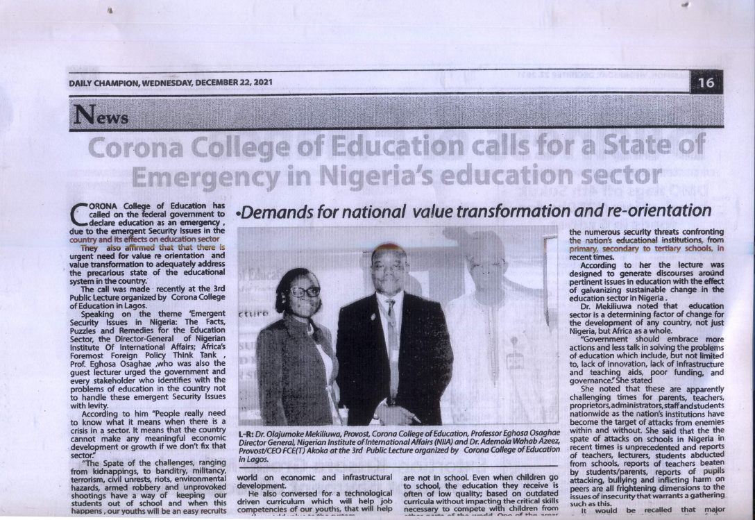 Corona College of Education Calls for a State of Emergency in Nigeria's Education Sector, Demands for National Value Transformation and Re-orientation