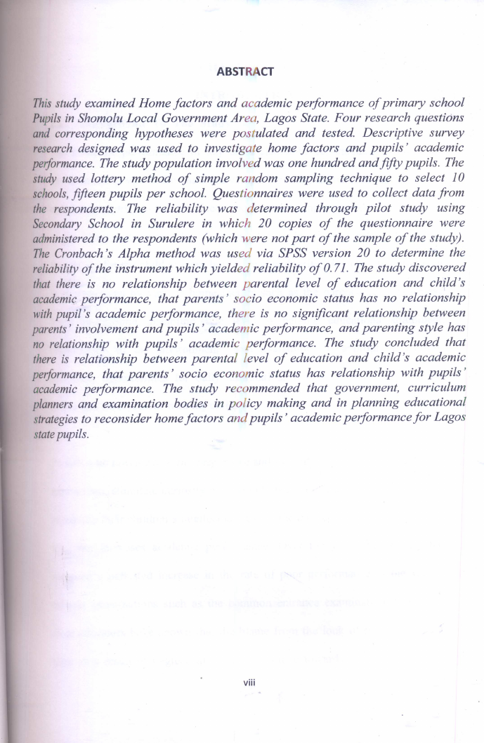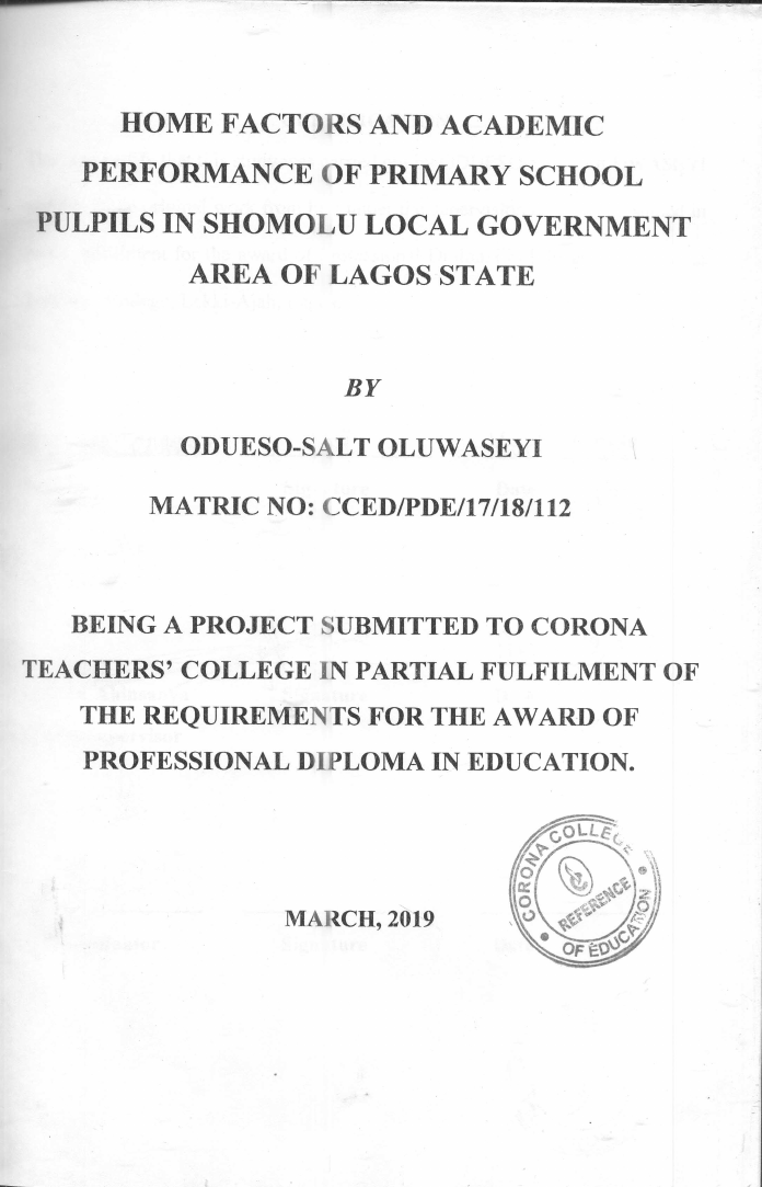 Home Factors and Academic Performance of Primary School Pupils in Shomolu Local Government Area of Lagos State. 2019. PDE