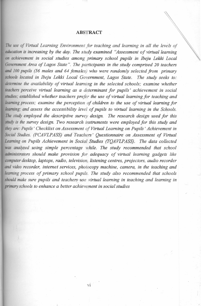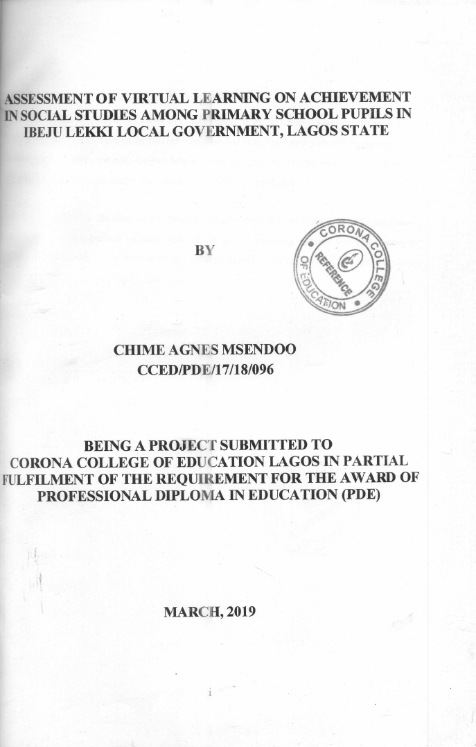 Assessment of Virtual Learning on Achievement in Social Studies Among Primary School Pupils in Ibeju Lekki Local Government, Lagos State. 2019. PDE