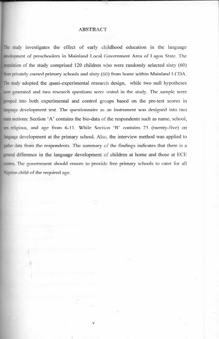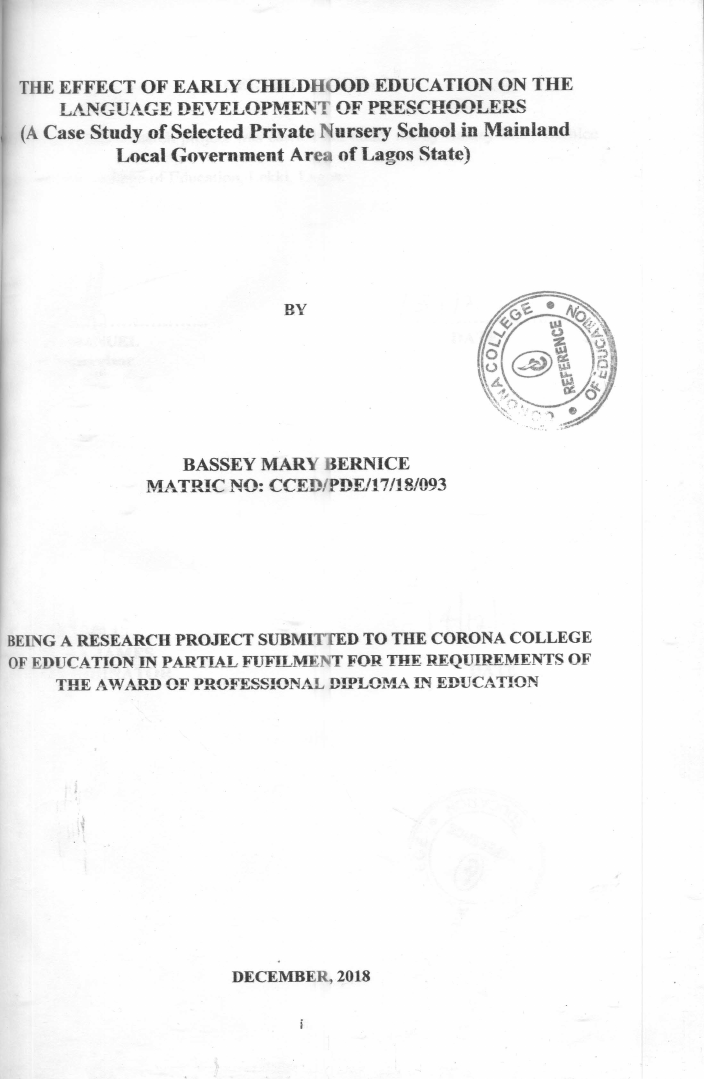 The Effect of Early Childhood Education on the Language Development of Preschools (A Case Study of Selected Private Nursery School in Mainland Local Government Area of Lagos State. 2018. PDE
